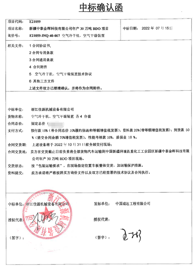 新疆中(zhōng)泰金晖科技有(you)限公司年産30萬(wan)噸BDO裝置及配套(tao)設施項目中标(biāo)确認函